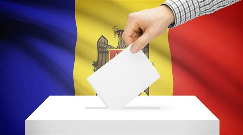 Hand putting a ballot into ballot box with a Moldovan flag in the background.